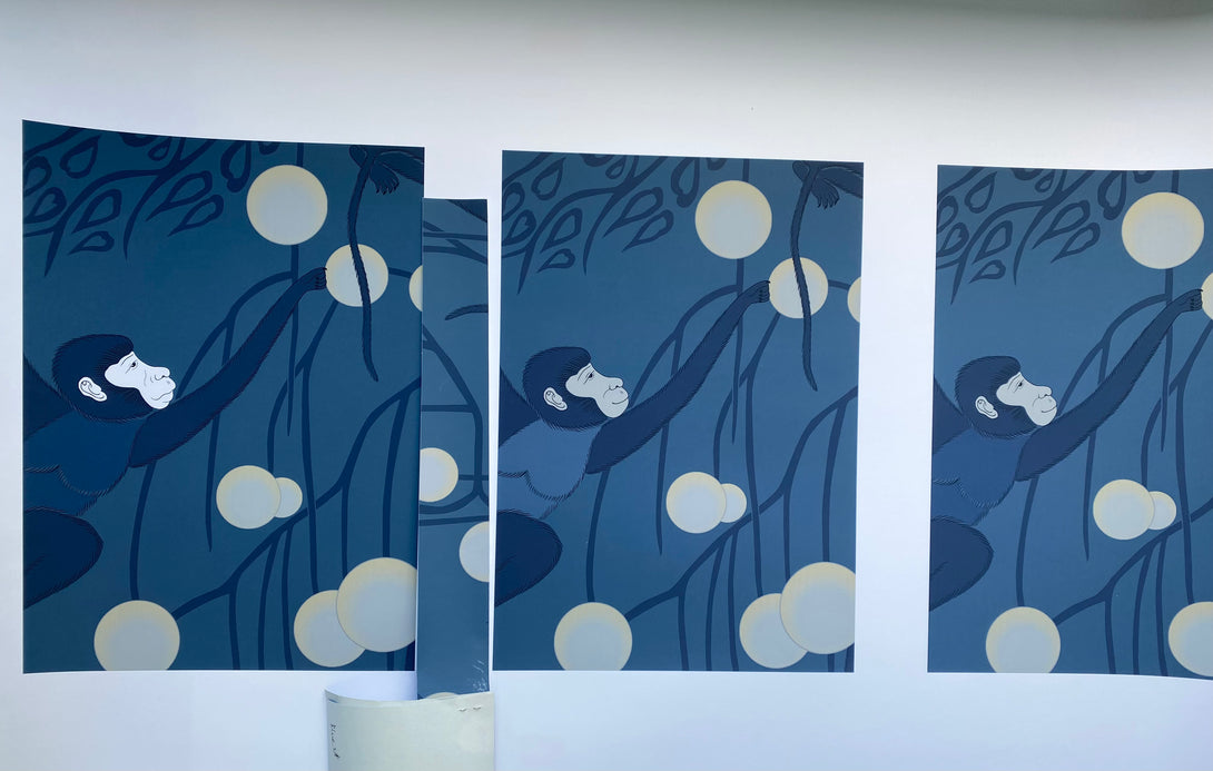 At the request of customers who want for this beautiful wallpaper but can not afford handpainted wallpaper price but want for the vivid and fine detailed pattern, can add patterns sucha as monkeys, butterflies, tigers, balloons, etc, revise the pattern height to fit the room size.