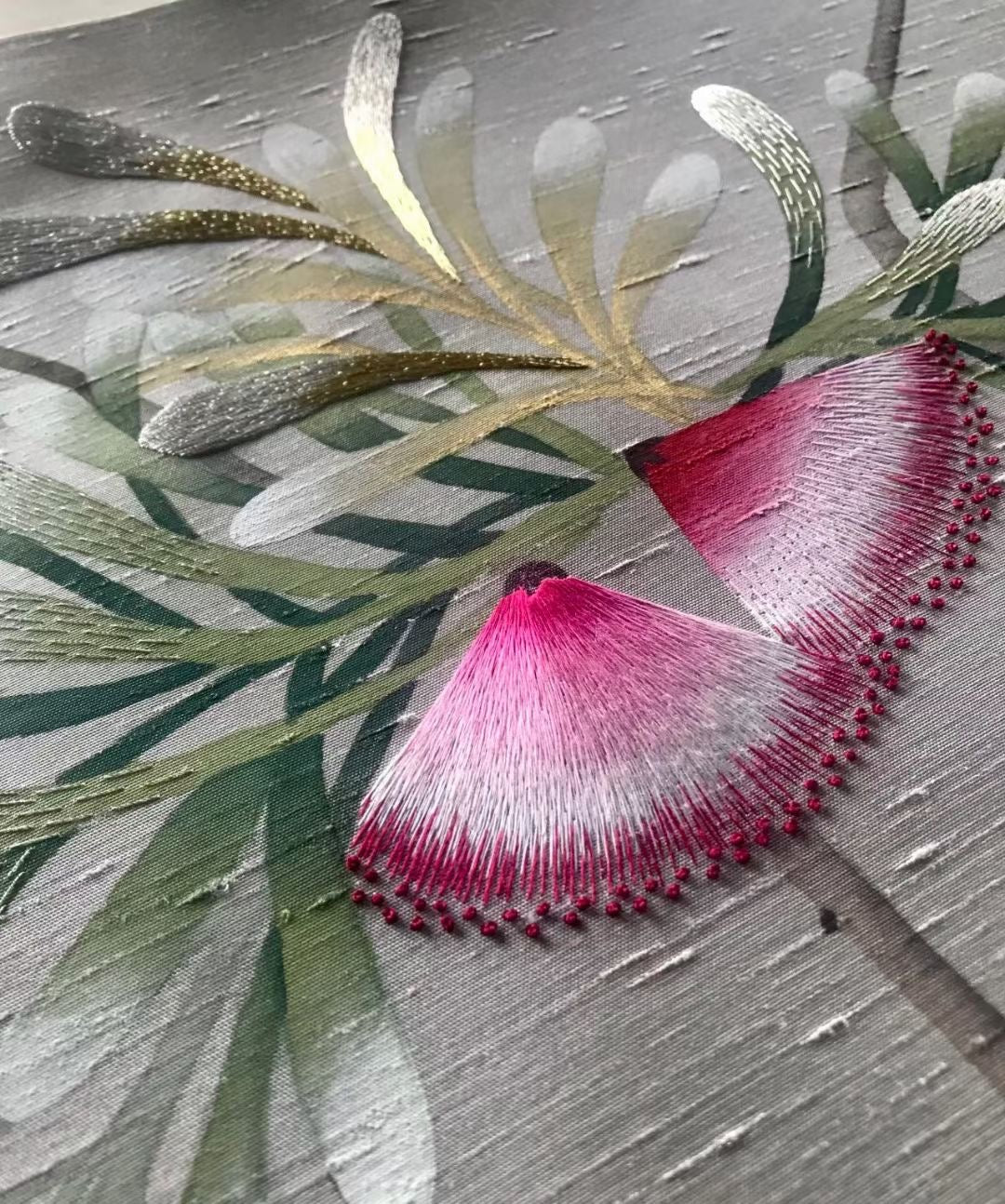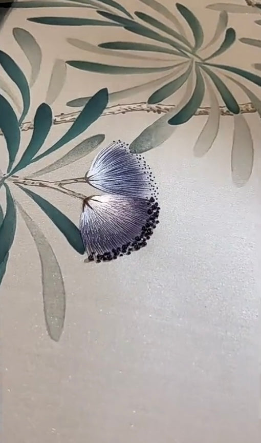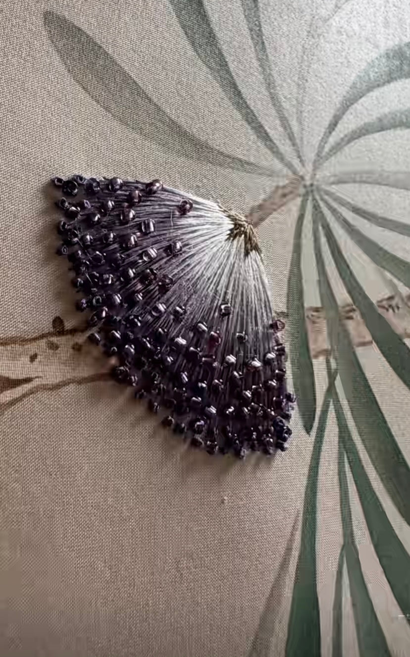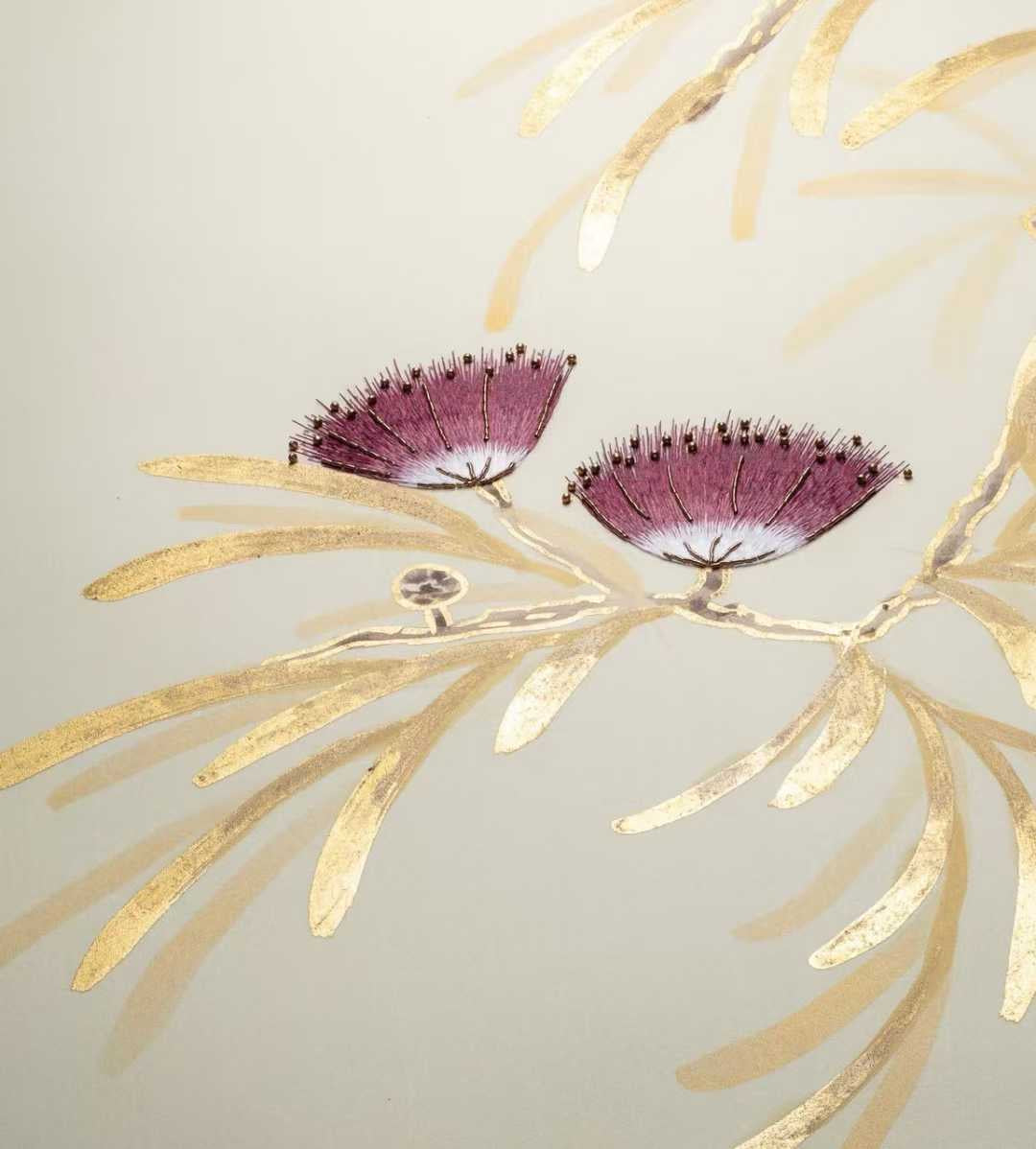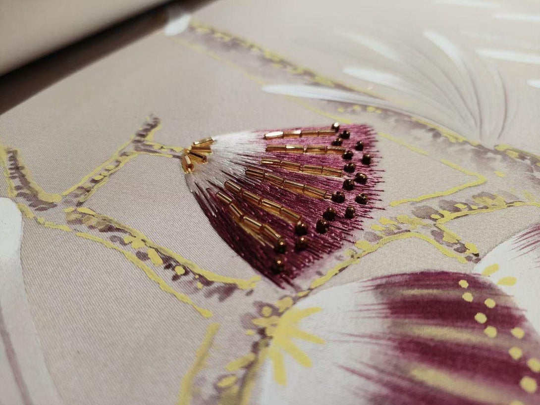 Fine silk embroidery can be added to all our silk wallpapers, adding an extra level of depth and intricacy. Beading can be applied alongside the embroidery or as a standalone technique. View our embroidered patterns